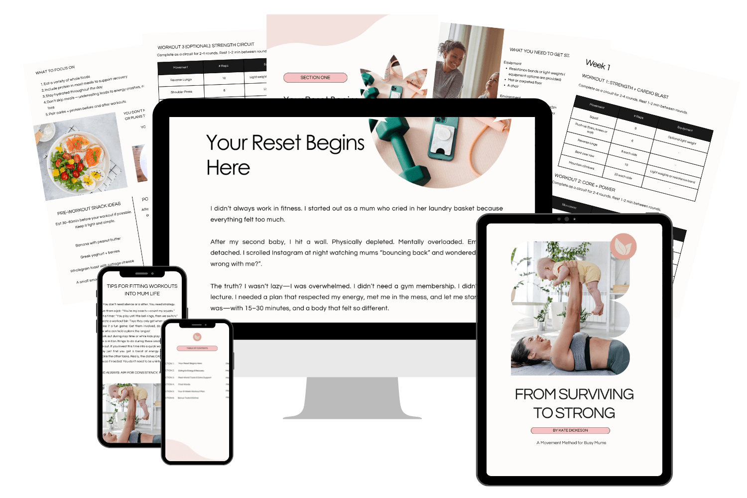 Get my complete 8-Week “From Surviving to Strong” system — the exact step-by-step plan I use to help busy mums build strength, energy, and confidence at home in ONLY 15-30 mins a few times a week (even with kids around!).